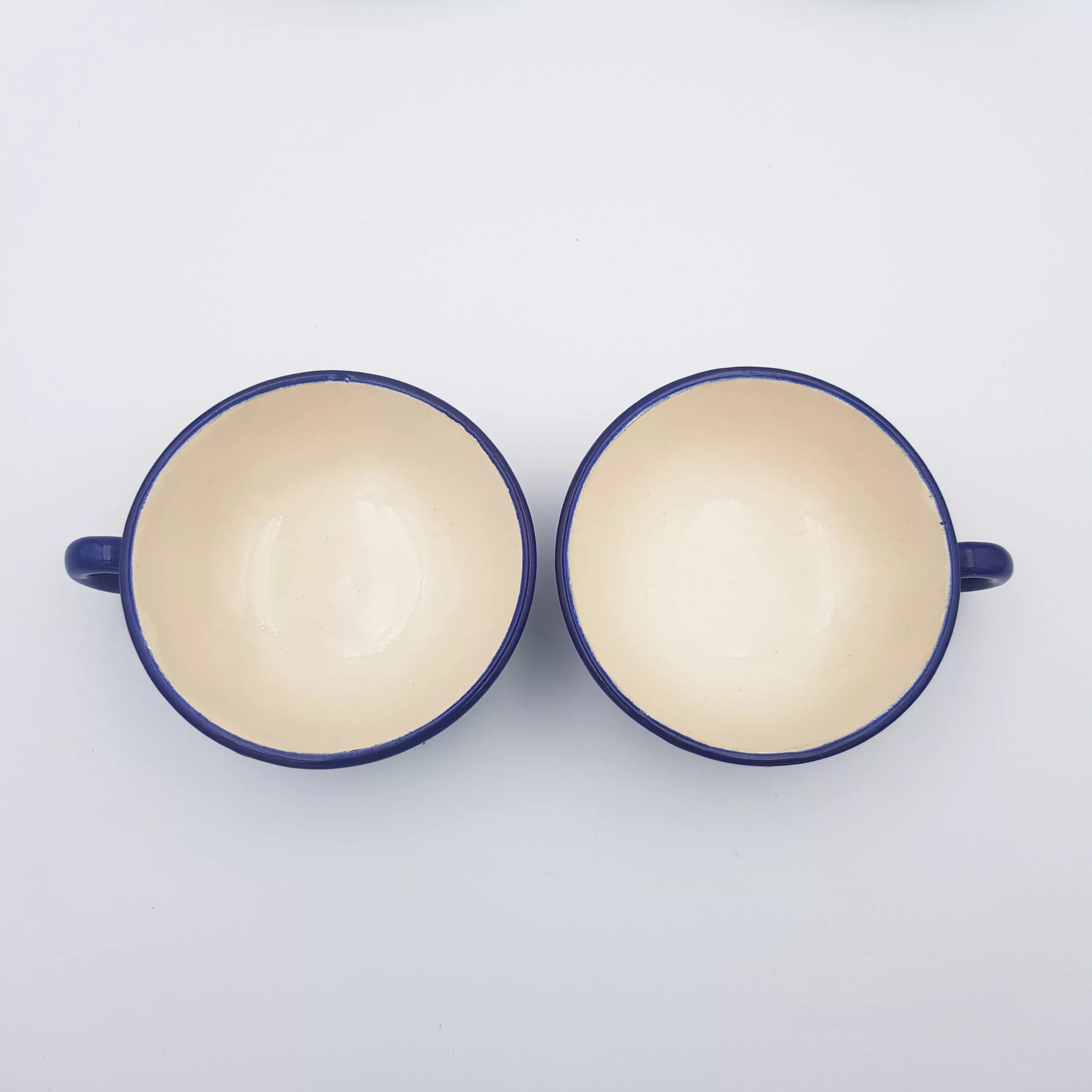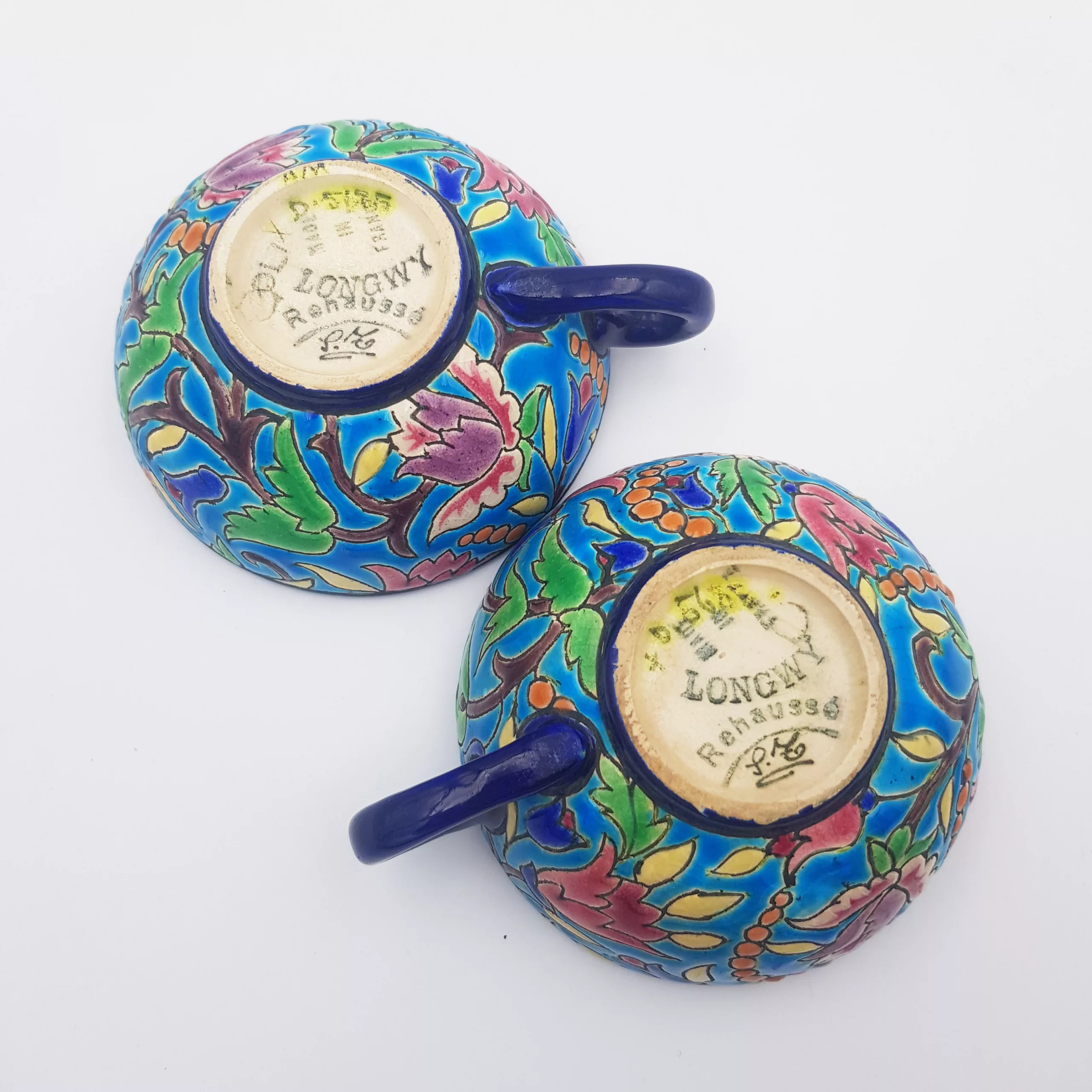 Antique small coffee cups from famous french manufacture of Longwy, known for their colorful naturalistic decors in cloisonne enamels. Capacity is 2 US fl oz, so that’s quite small, for coffees like espresso or ristretto. Come with their matching saucers and a rectangular serving dish with handles. The tray can be used either for serving the cups or as a cake dish.