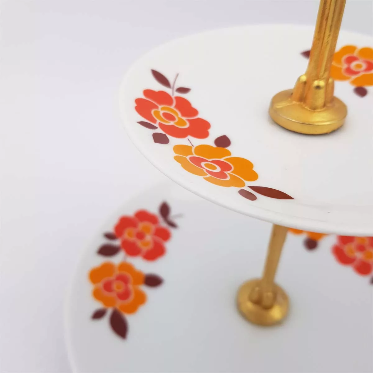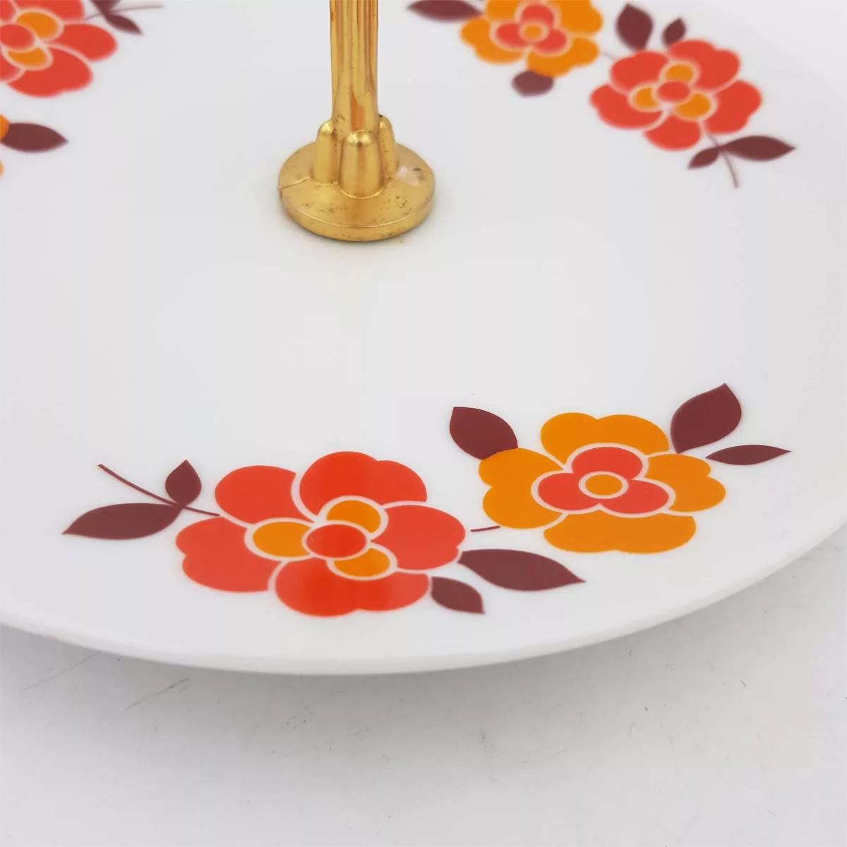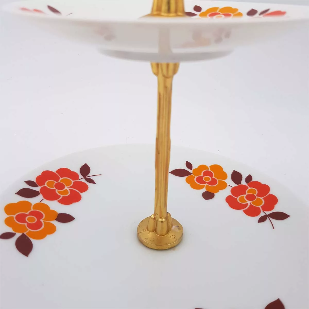 Pretty vintage cake display stand from Marktleuthen Bavaria West Germany, obviously 1970s ! 2 plates in porcelain with a decoration of stylized flowers in the very tones of the 1970s : red, orange and brown. Mounting in gilt metal. Diameters 11,5cm and 17,5cm. Handle to lift it easily.