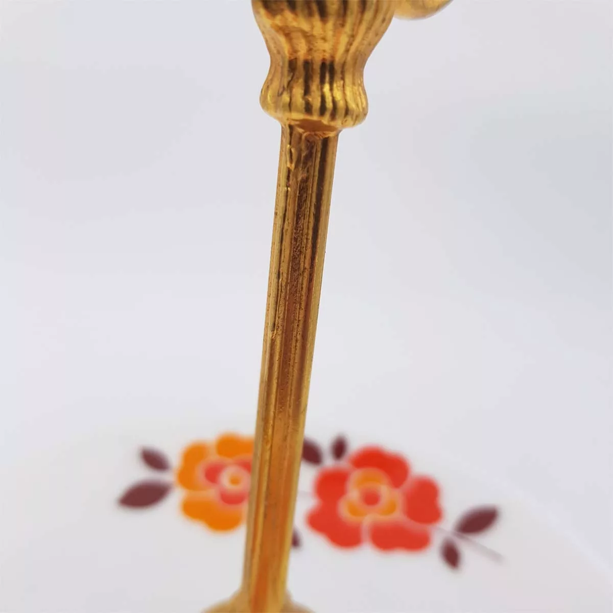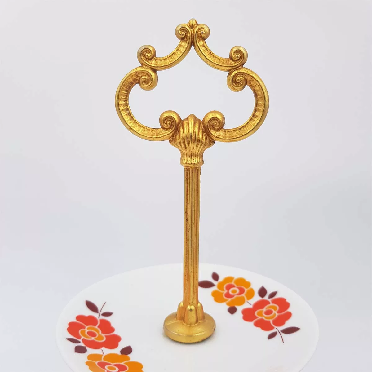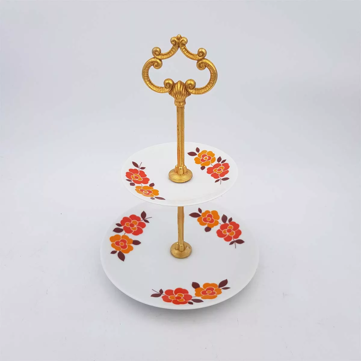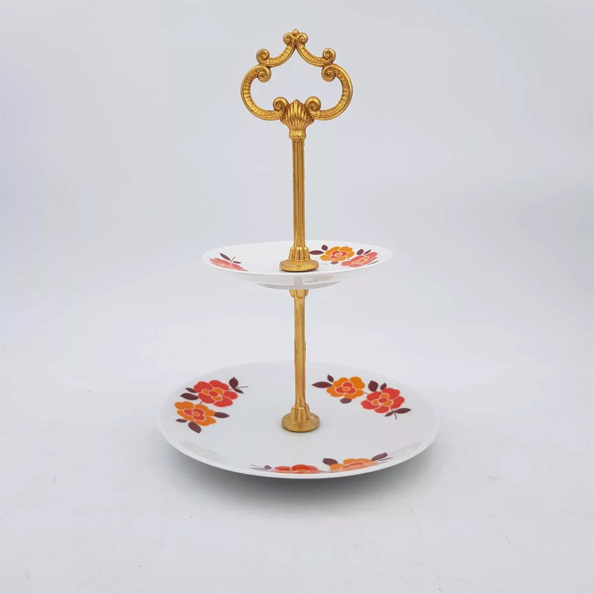 Pretty vintage cake display stand from Marktleuthen Bavaria West Germany, obviously 1970s ! 2 plates in porcelain with a decoration of stylized flowers in the very tones of the 1970s : red, orange and brown. Mounting in gilt metal. Diameters 11,5cm and 17,5cm. Handle to lift it easily.