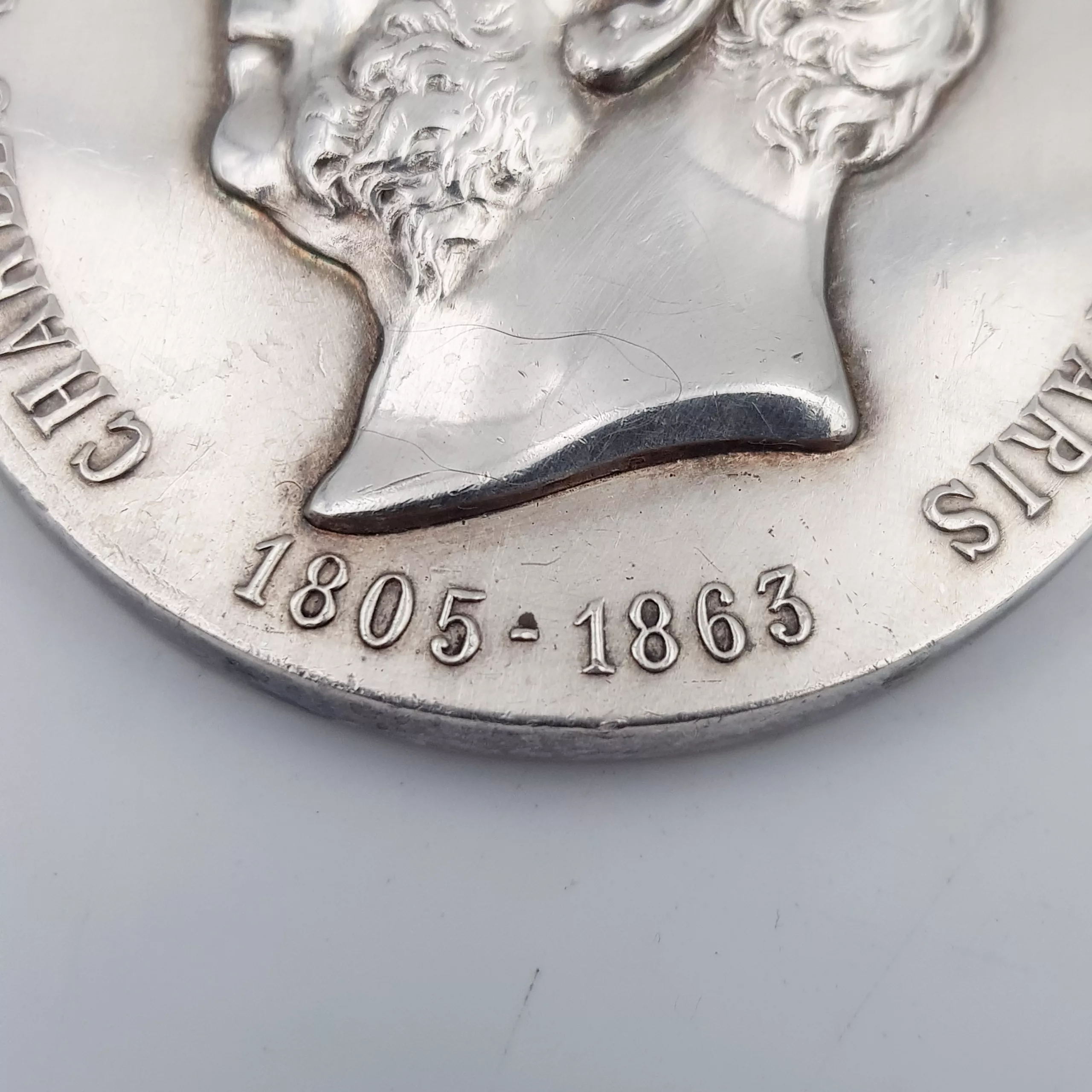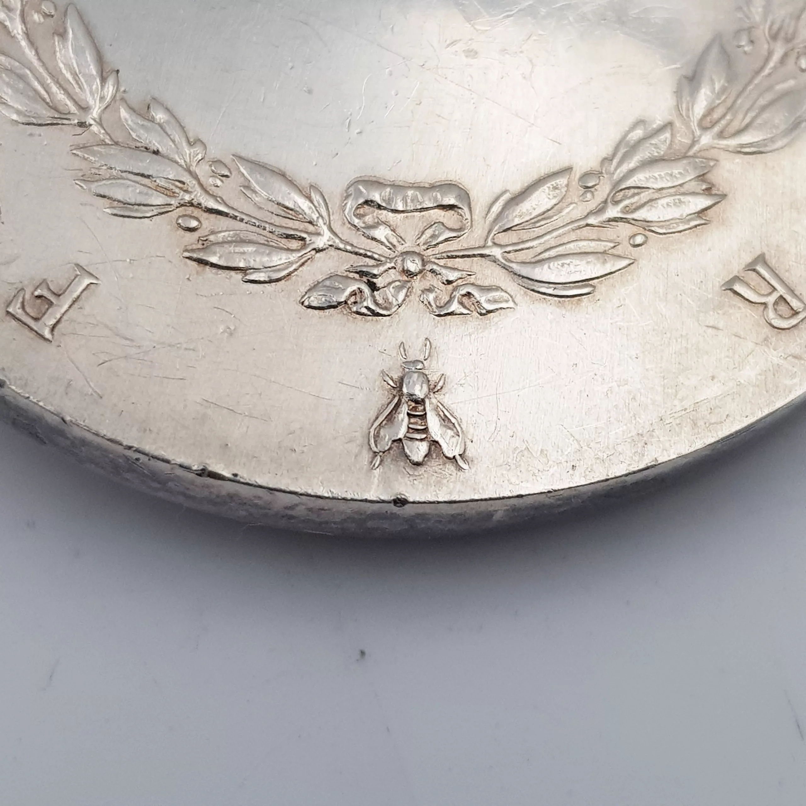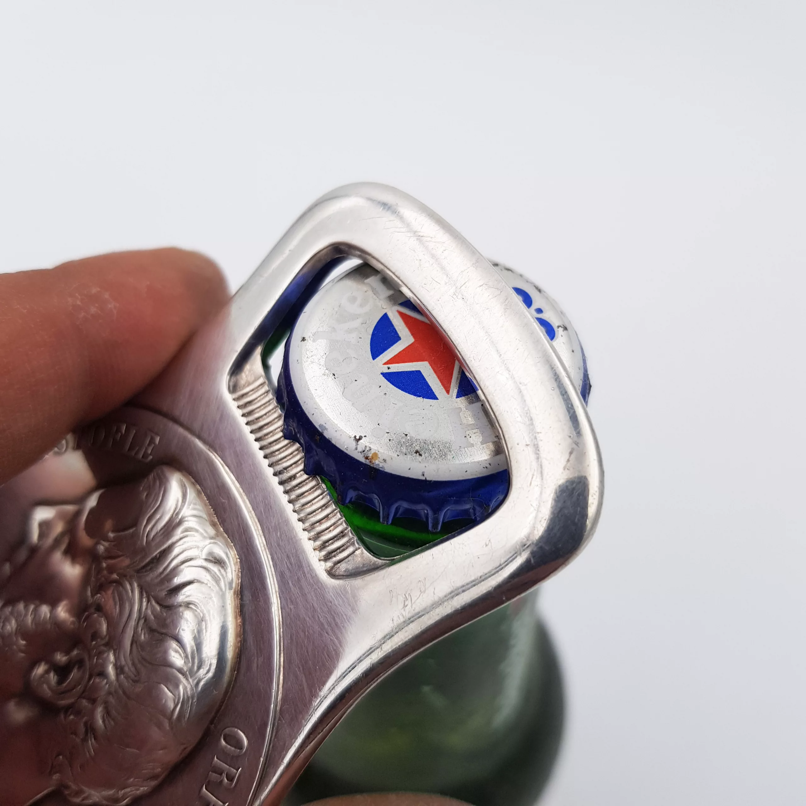 Christofle silver plated bottle opener with an embossed portrait of famous french silversmith Charles CHRISTOFLE, with its dates of birth and death (1805-1863), and the mention “ORFEVRE A PARIS” (“Silversmith, Paris”). On the back, two laurel crowns and the imperial bee + mention “Fournisseur de l’Empereur” (“Provider of the Emperor”, the Emperor being NAPOLEON III)