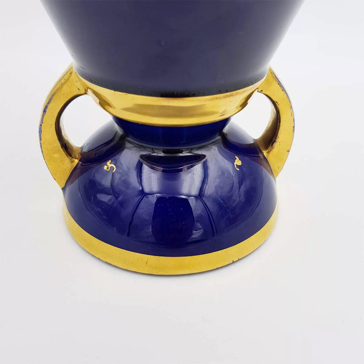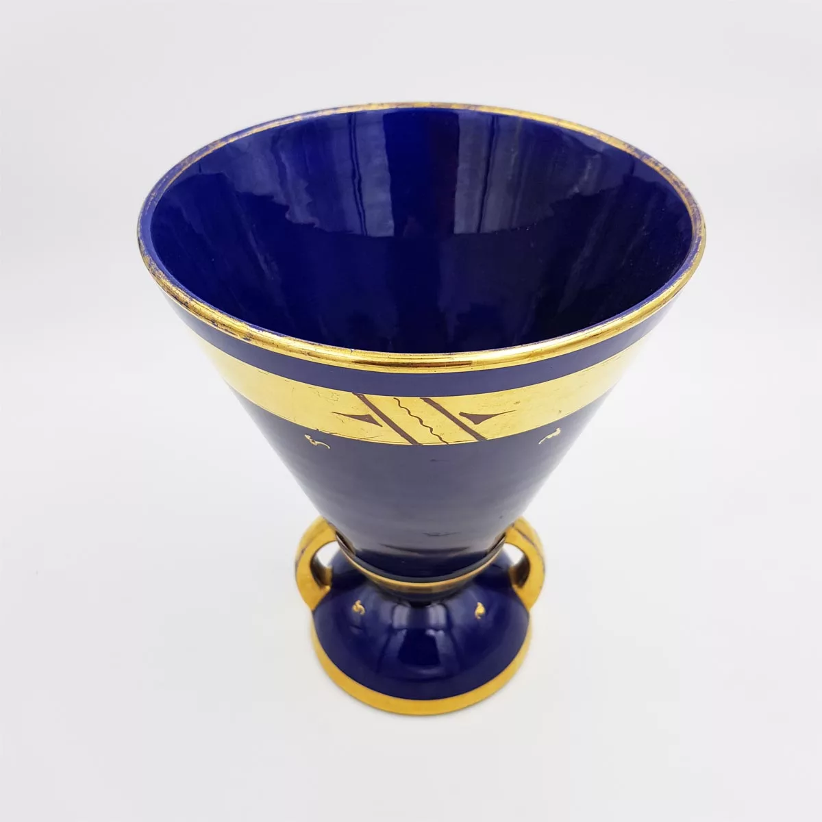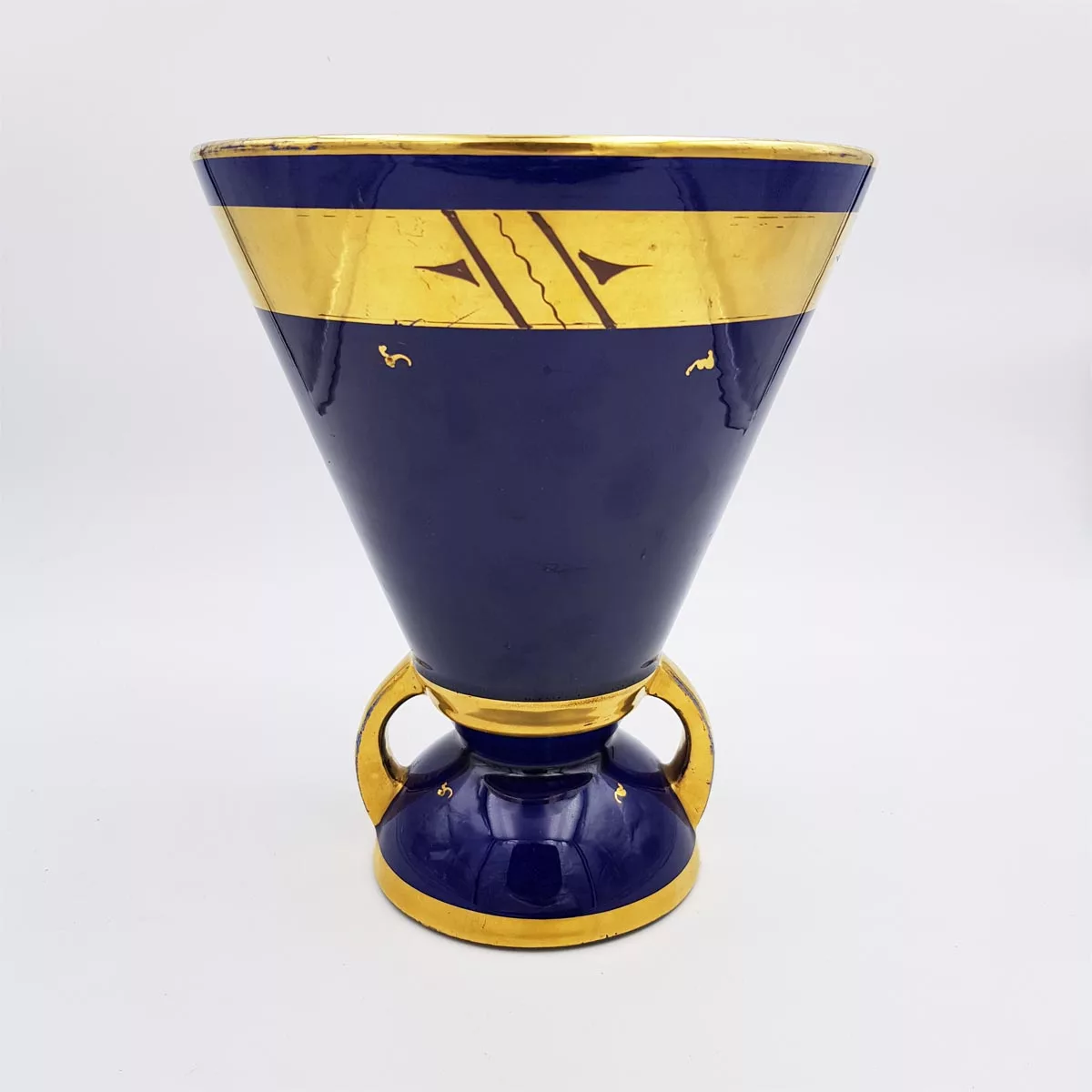 Beautiful ceramic vase typical from the French Art Deco period (1930-1940) with its geometrical shape. Blue color similar to the famous “Bleu de SĆØvres”, complemented by gilt patterns.