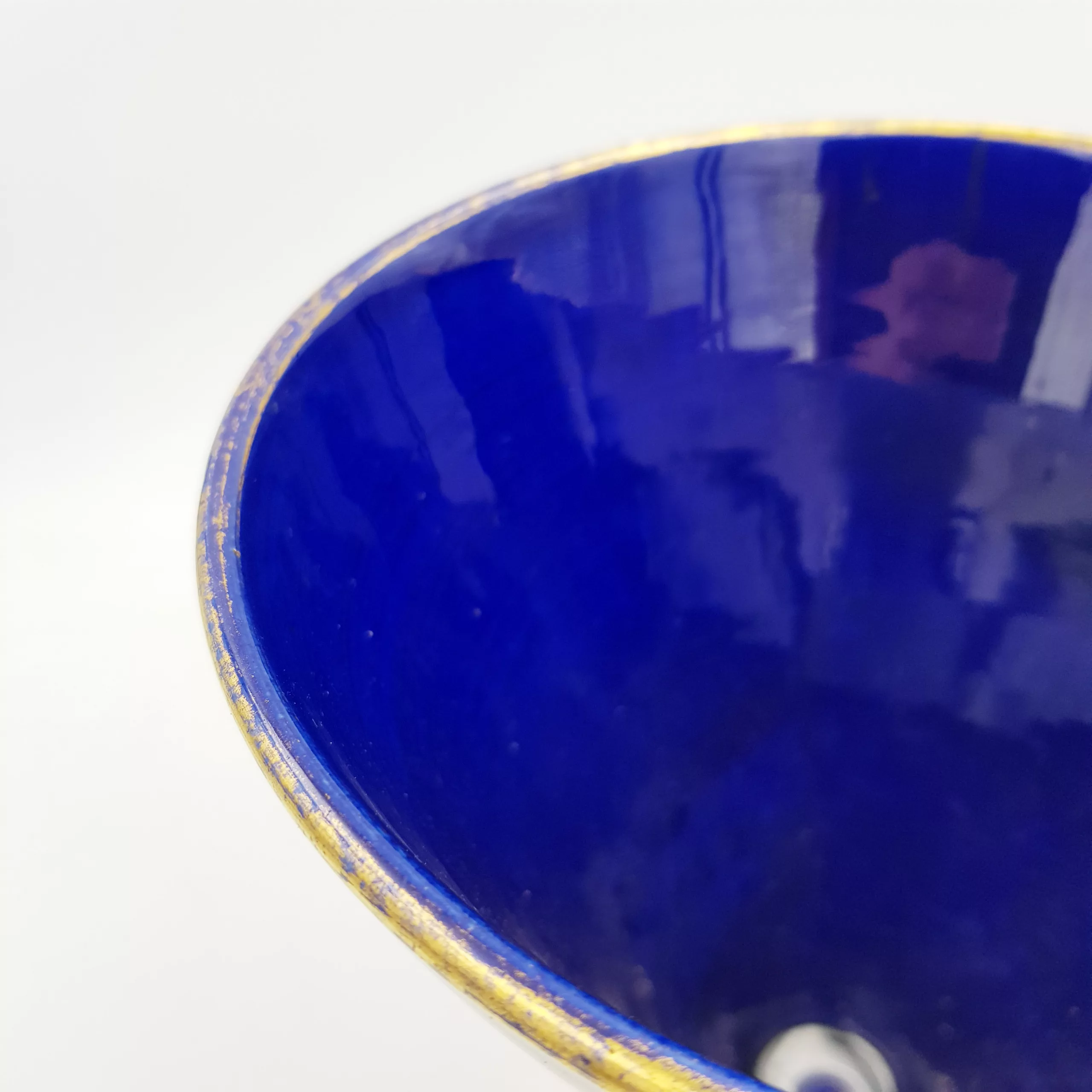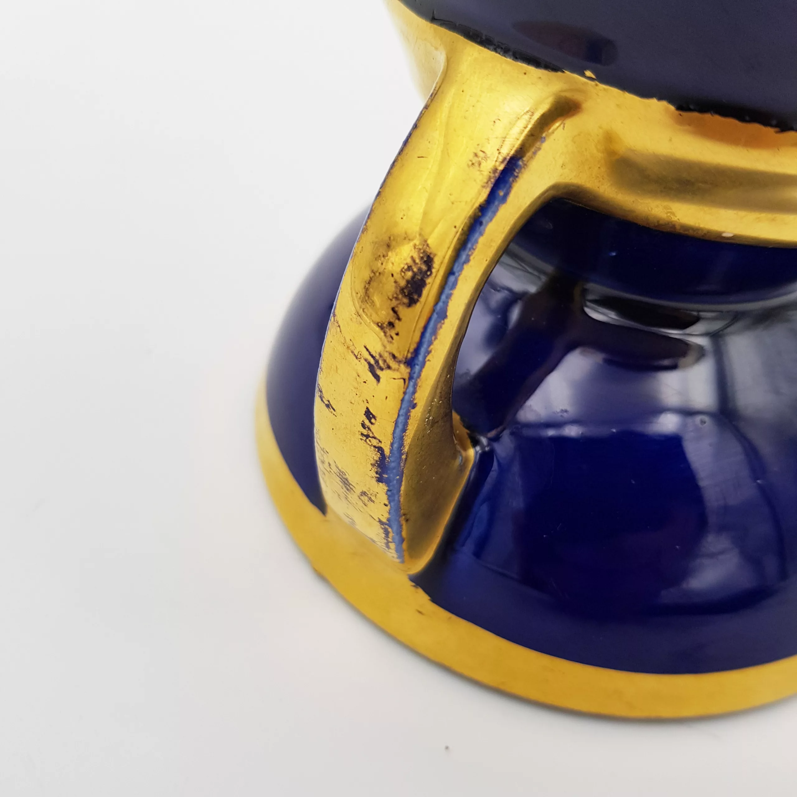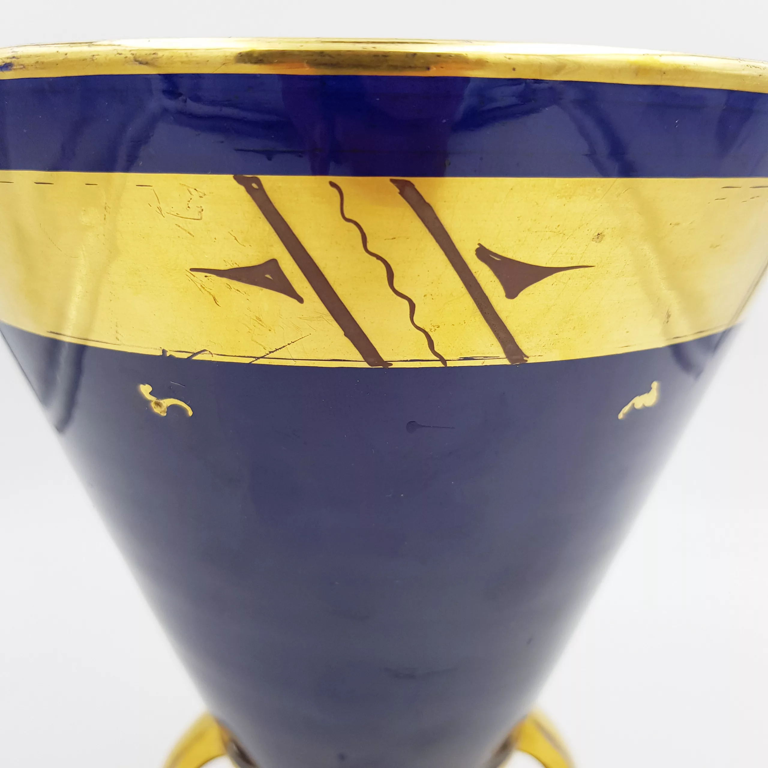 Beautiful ceramic vase typical from the French Art Deco period (1930-1940) with its geometrical shape. Blue color similar to the famous “Bleu de SĆØvres”, complemented by gilt patterns.