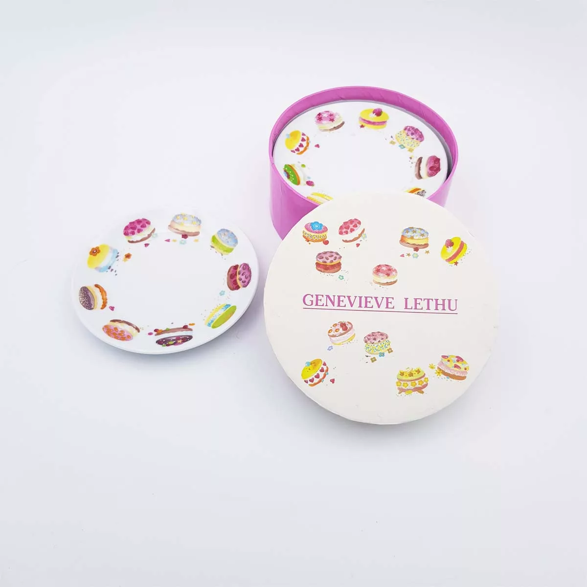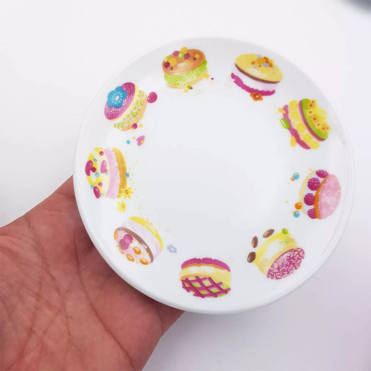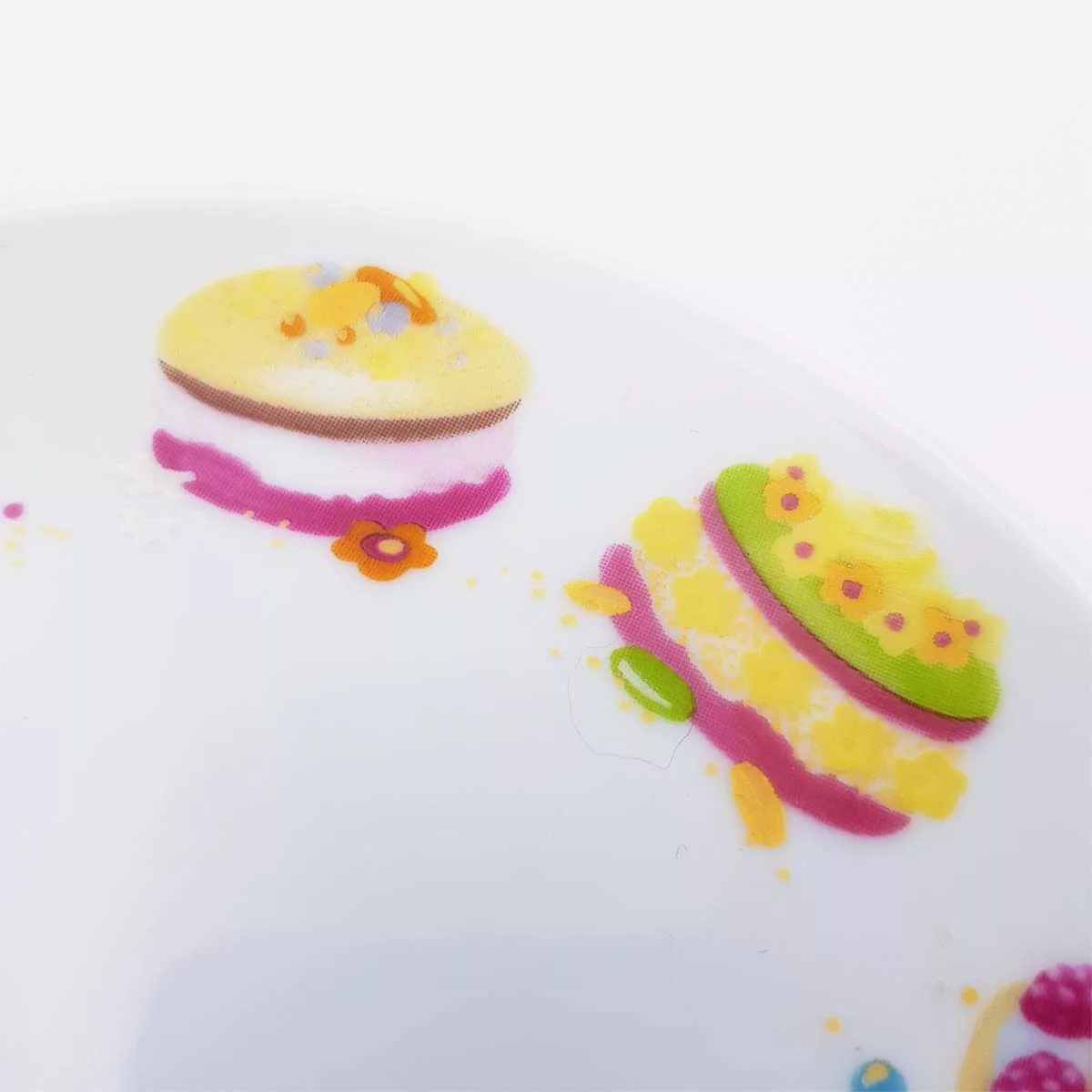 Round ceramic, white background, decoration of small cakes all around the plates. Warning small diameter 12.3cm !