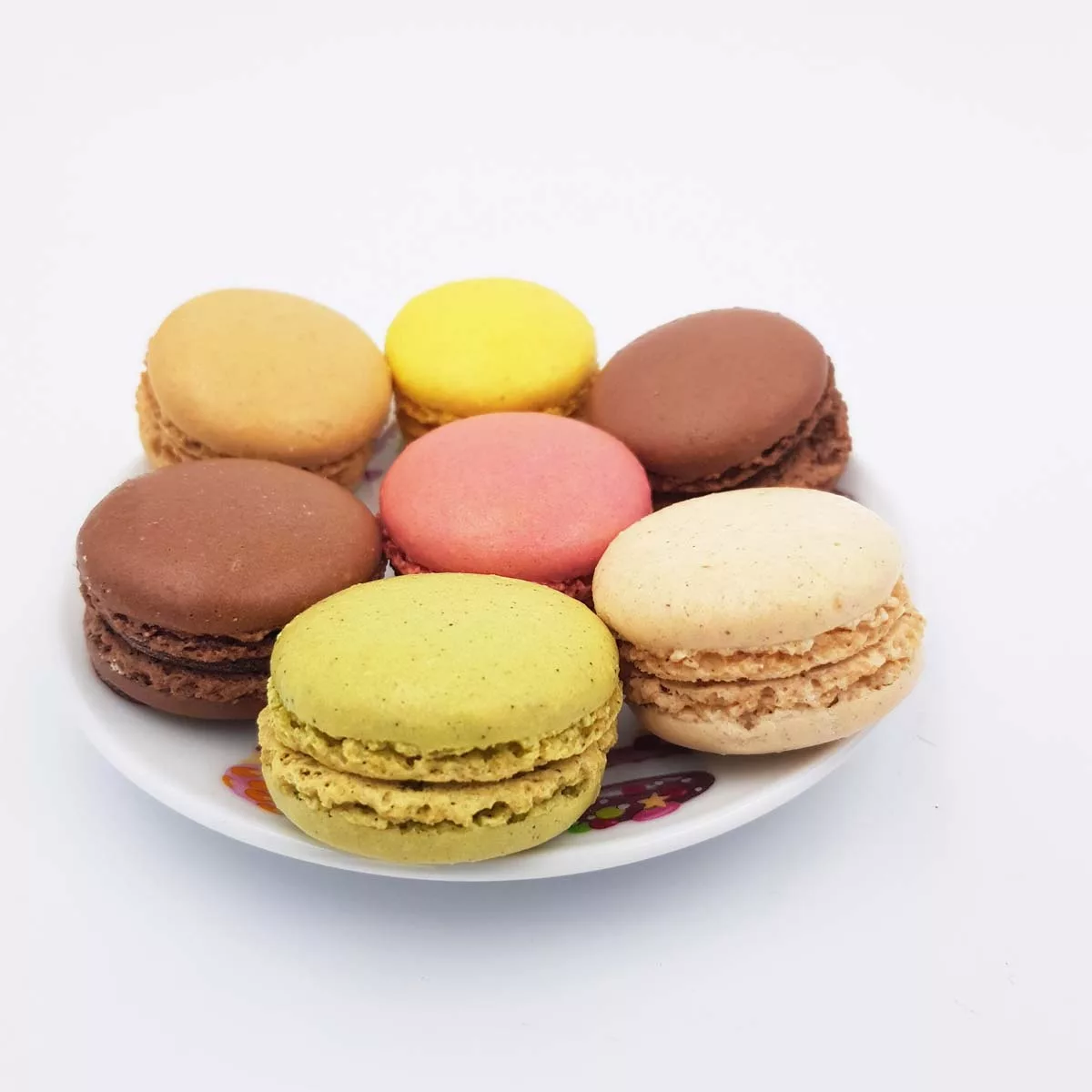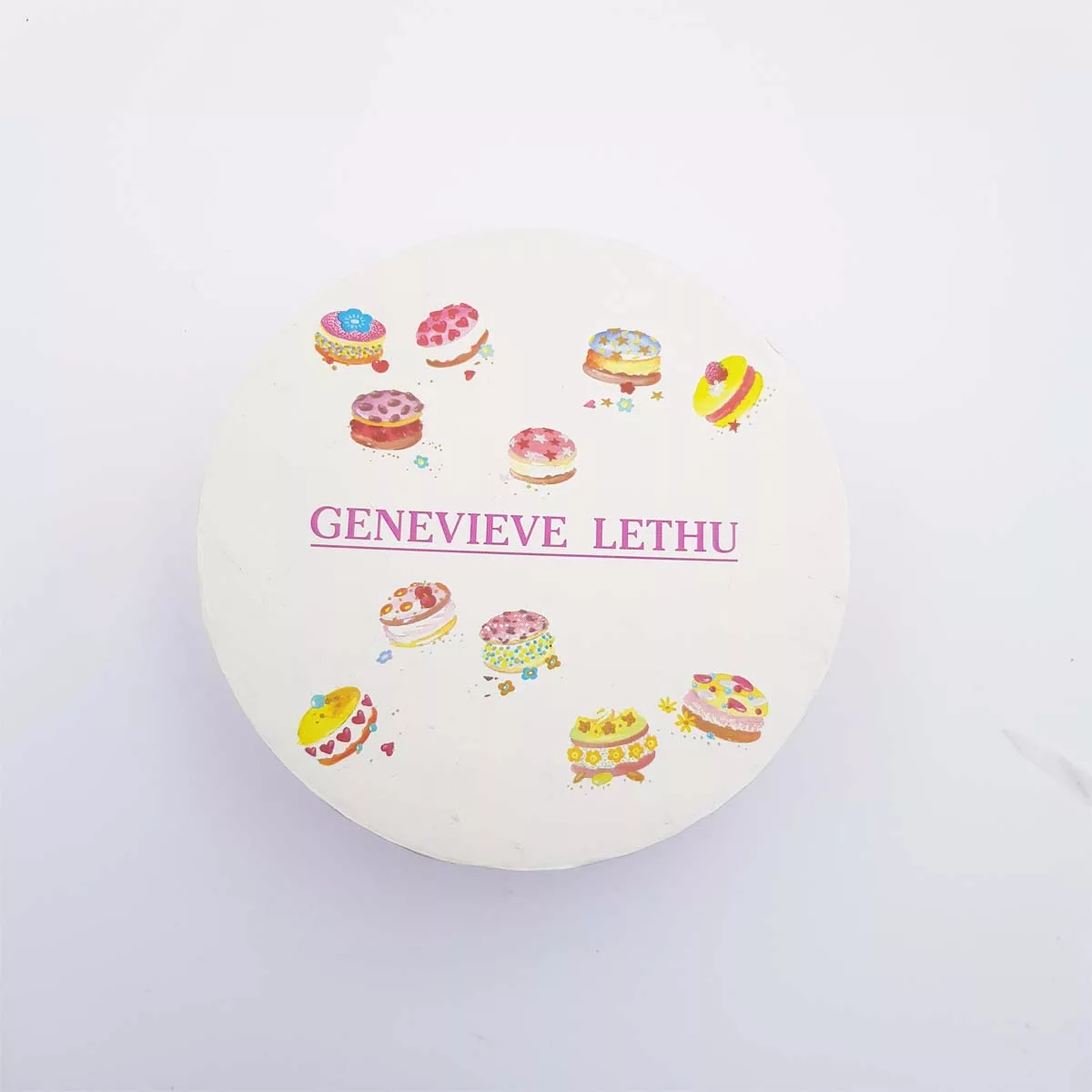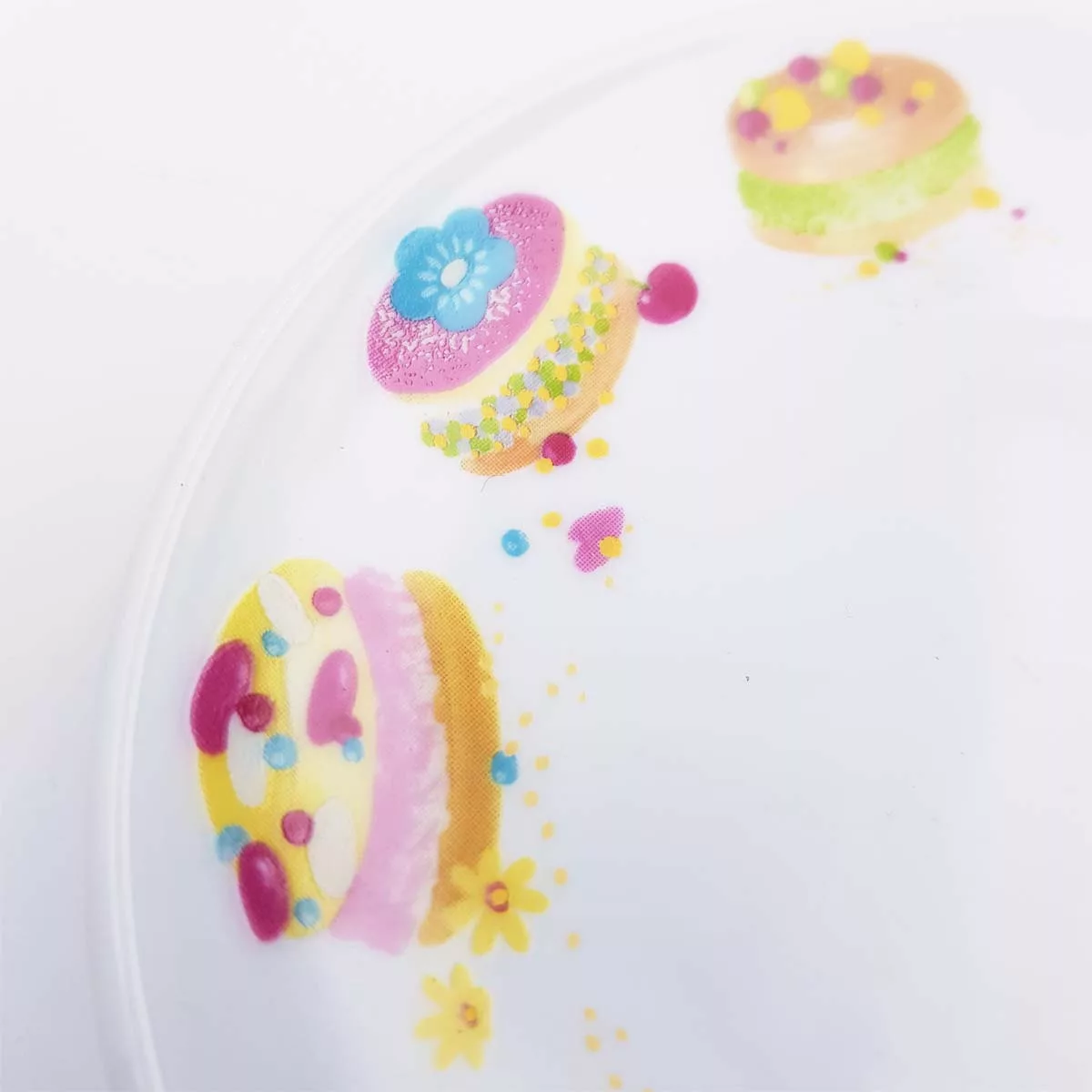 Round ceramic, white background, decoration of small cakes all around the plates. Warning small diameter 12.3cm !
