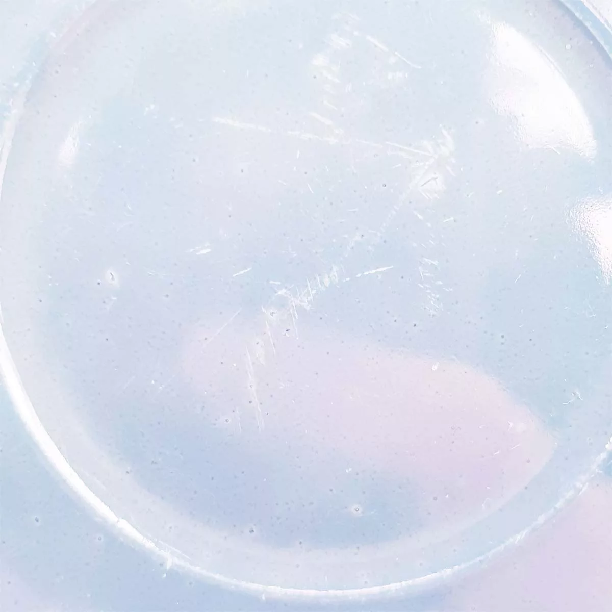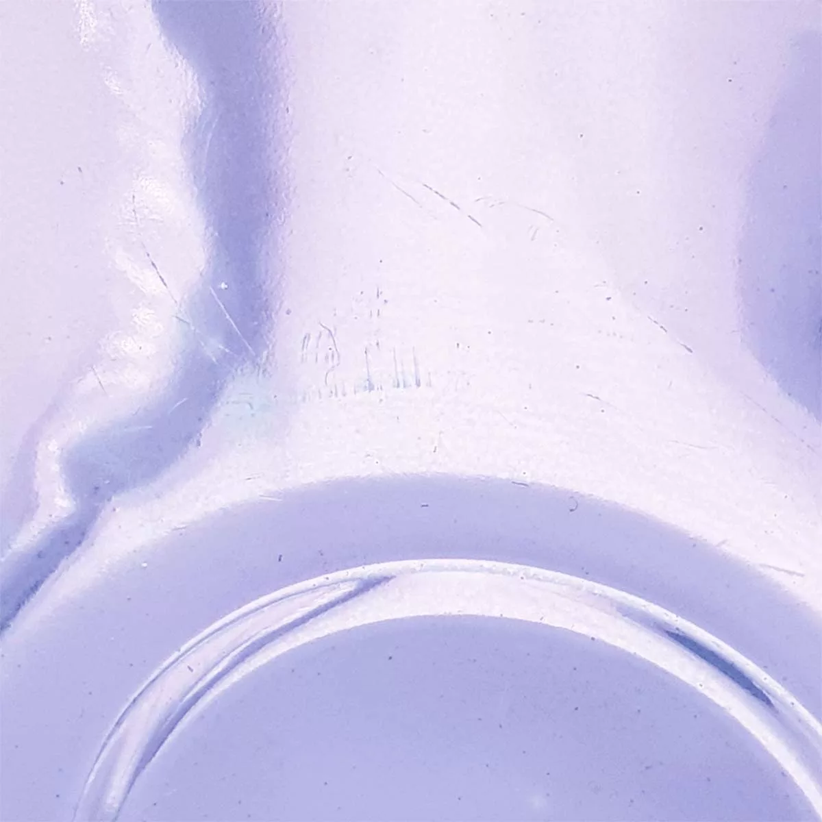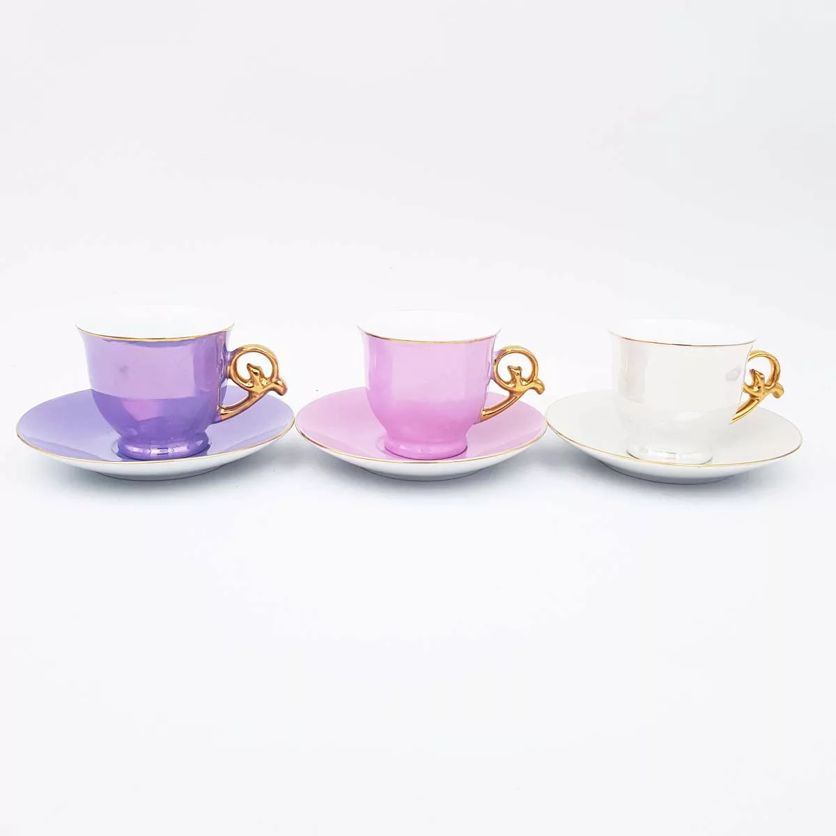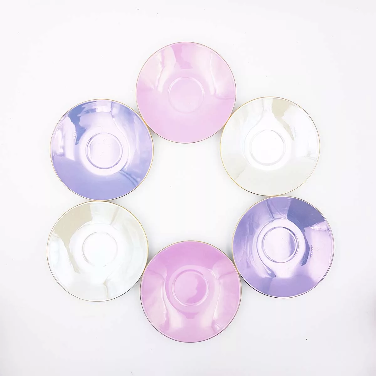Pastel colors in pink, purple and white / cream tones with an iridescent glaze on both the cups and saucers.