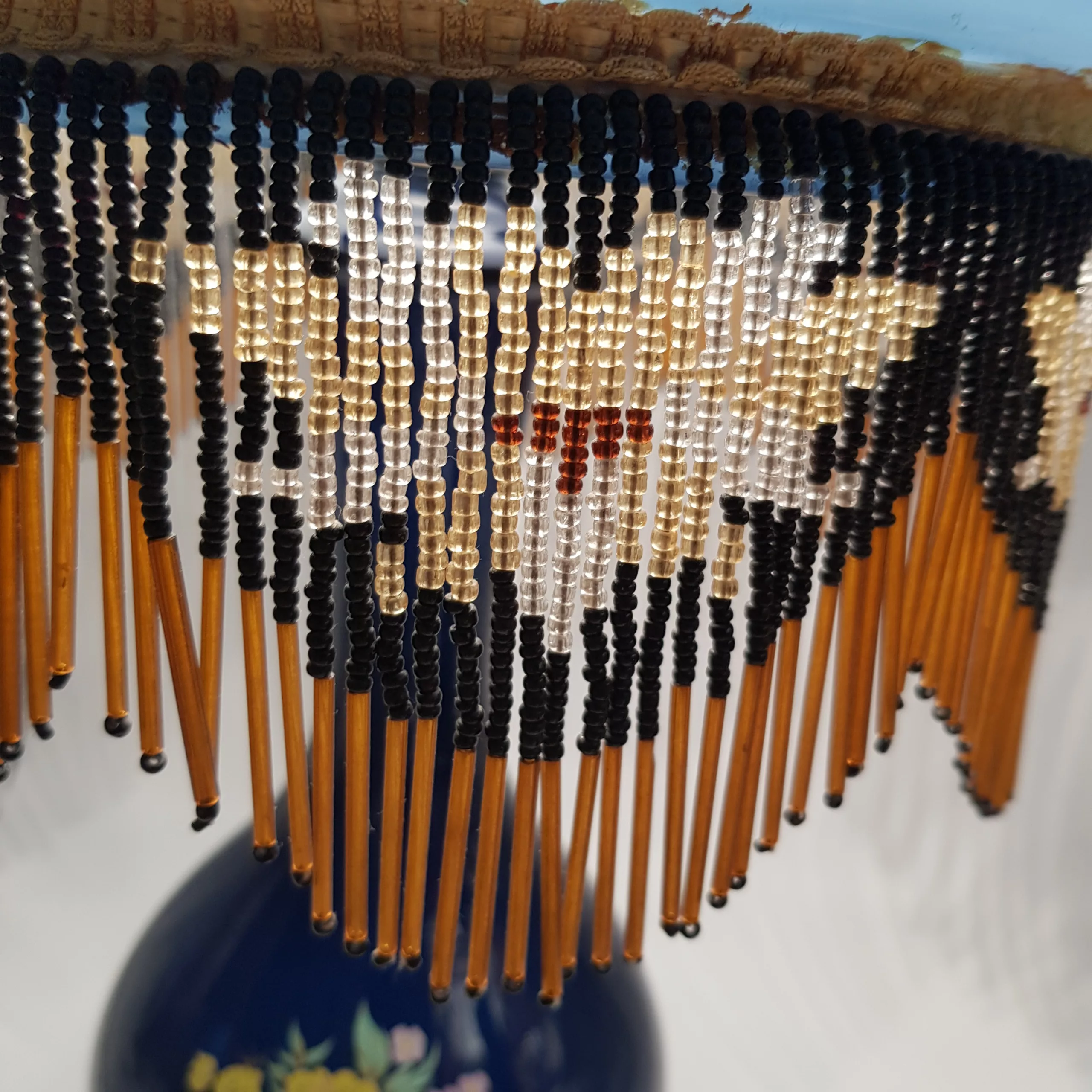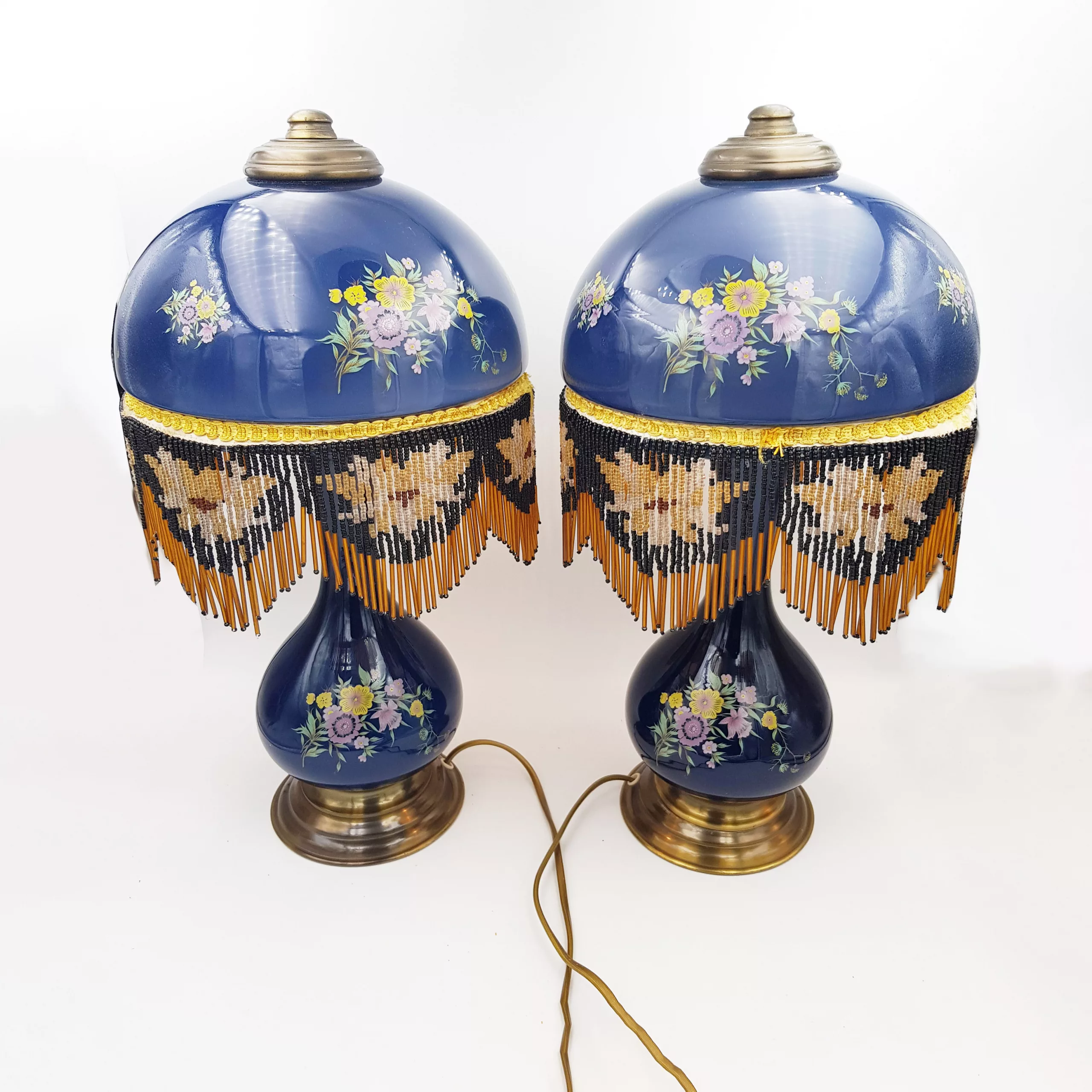 Splendid pair of antique lamps with dark blue glass domes as lampshades. Fancy polychrome floral decoration with a dominance of yellow, green and purple/pink tones. Fringes of black and orange brown pearls all around the lampshades forming geometrical patterns of what could be butterflies.