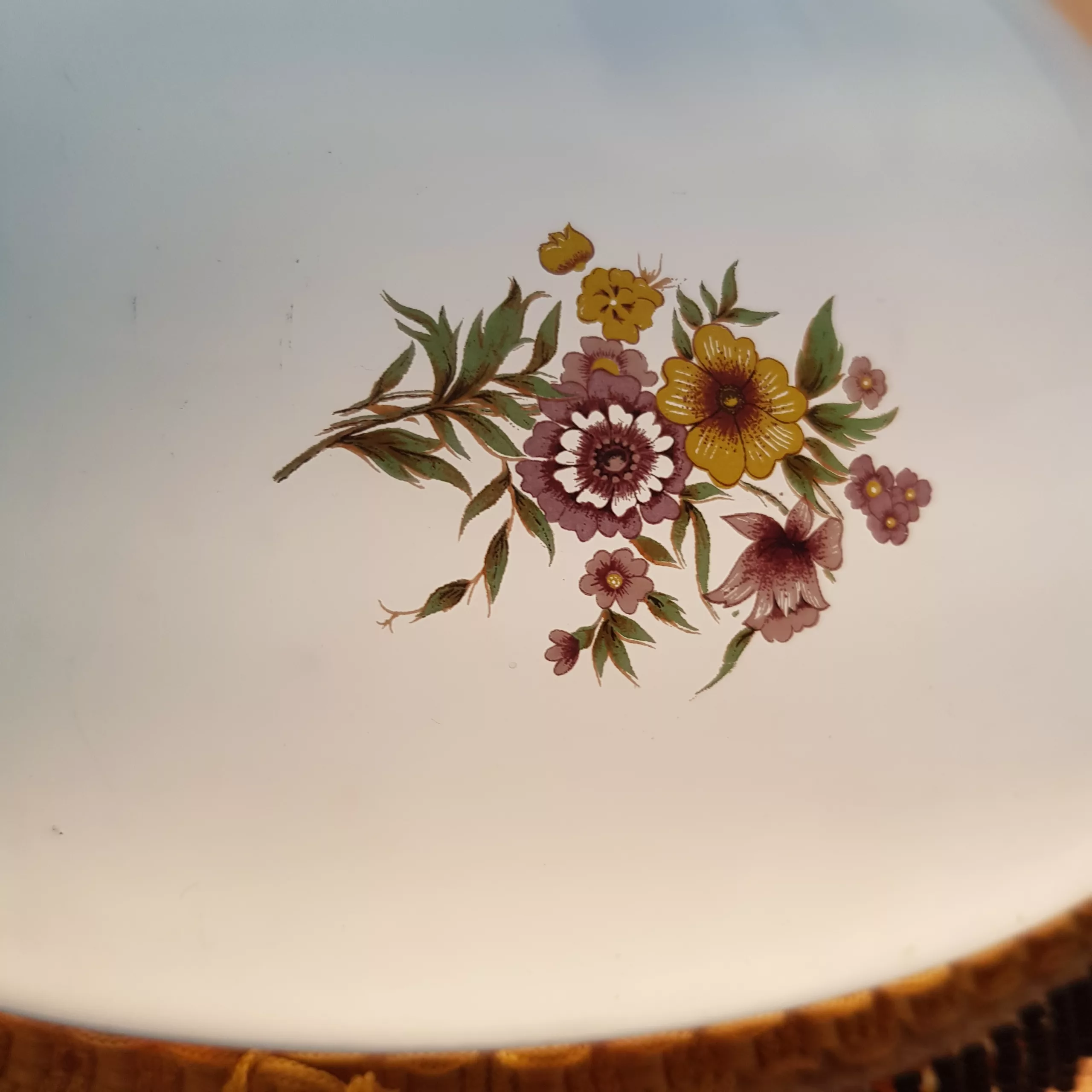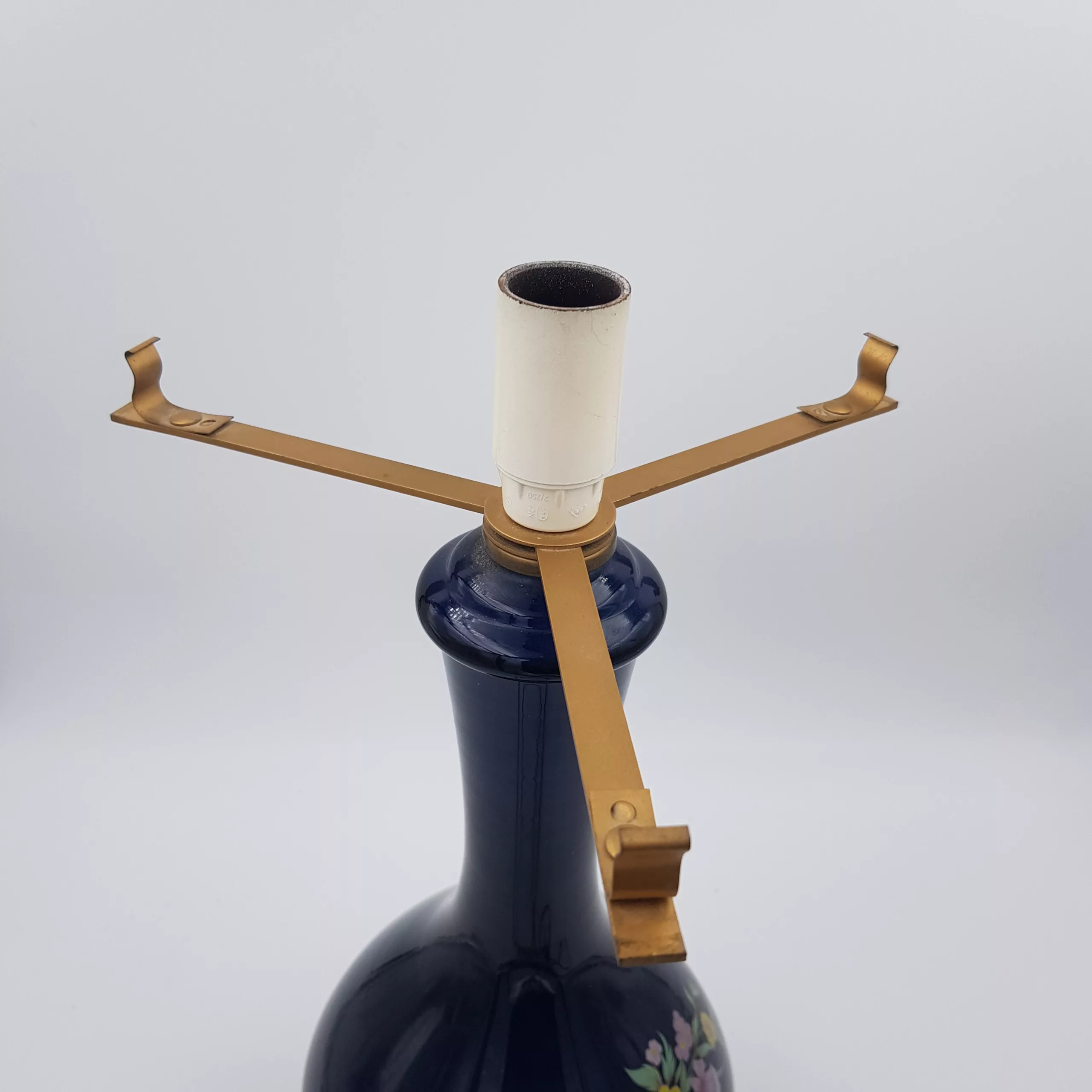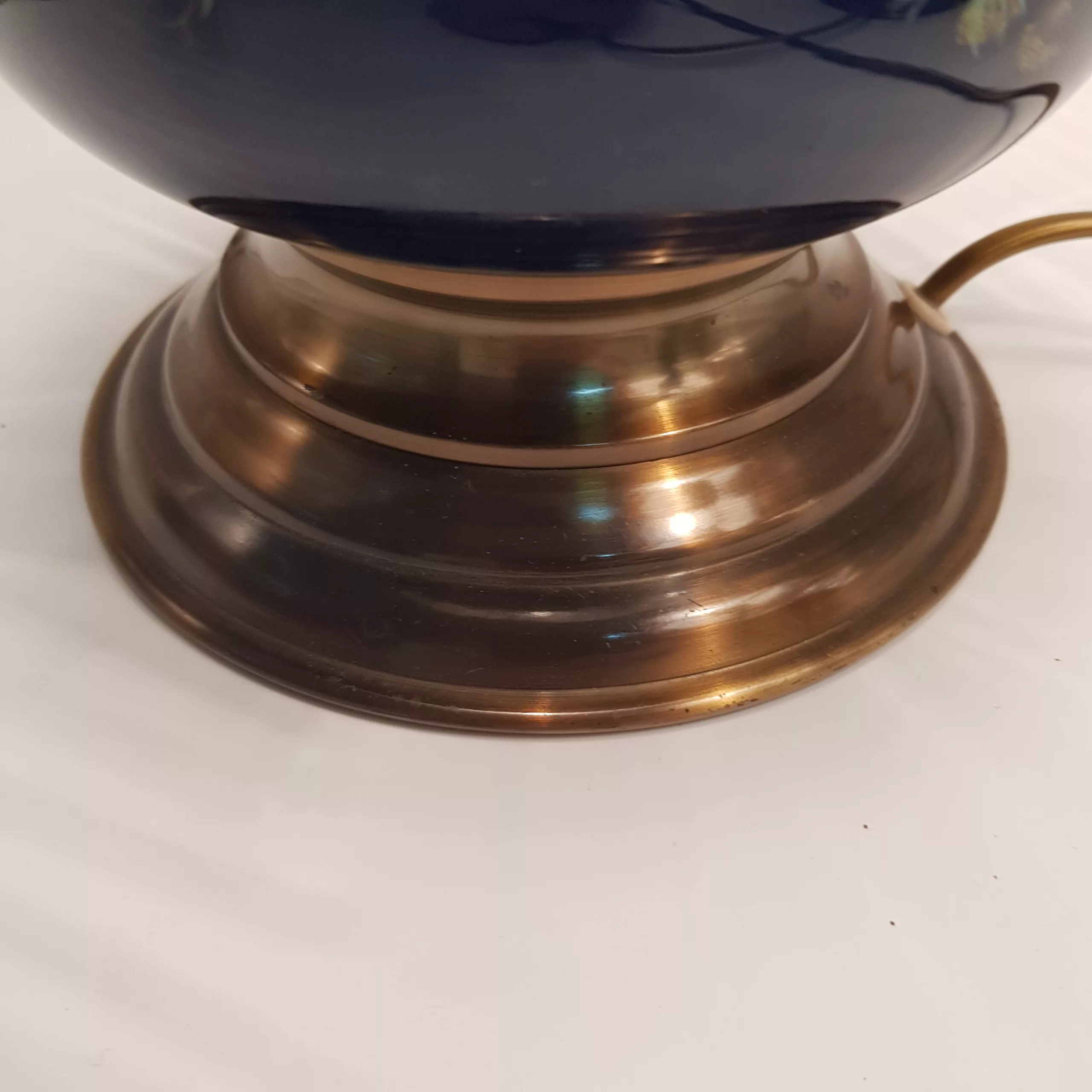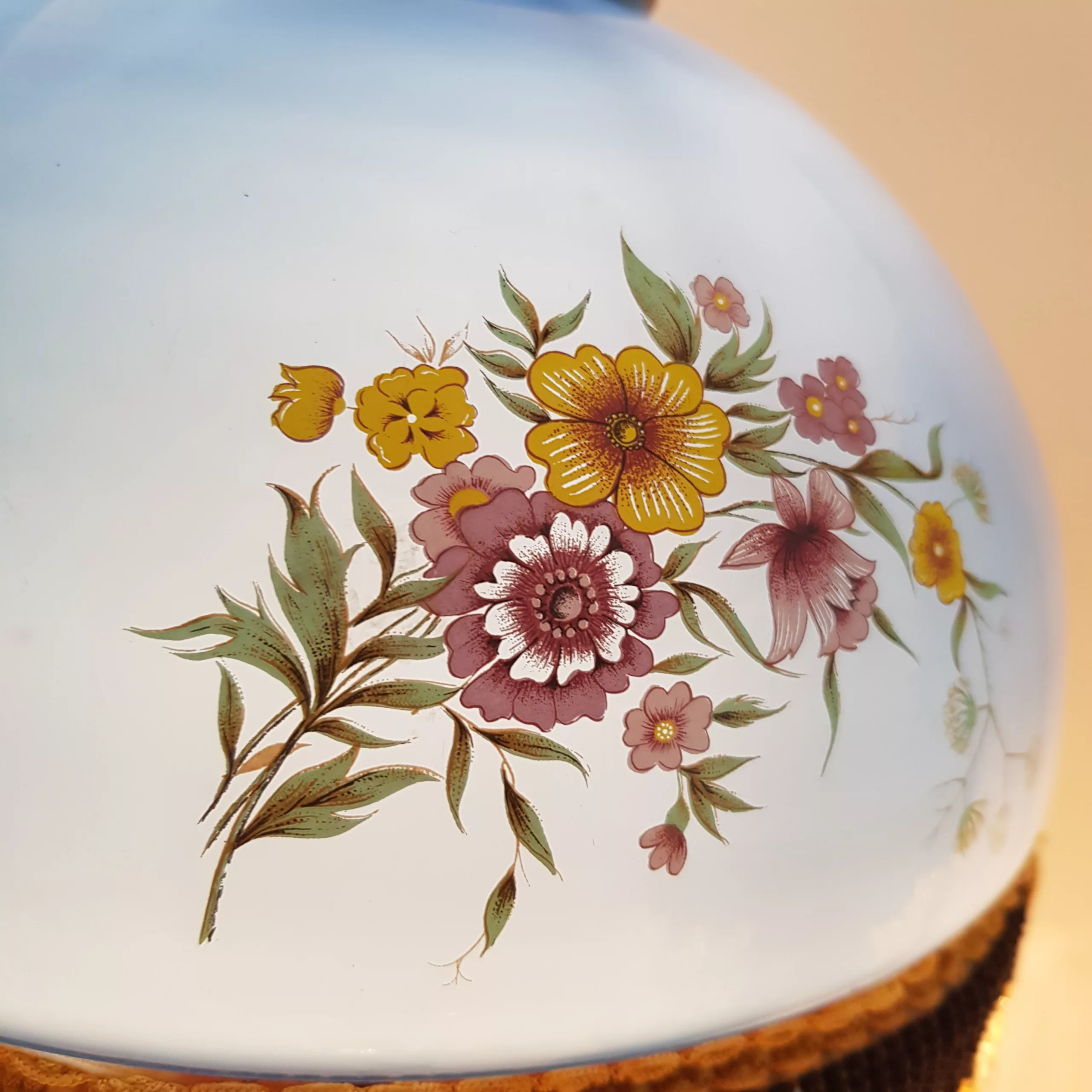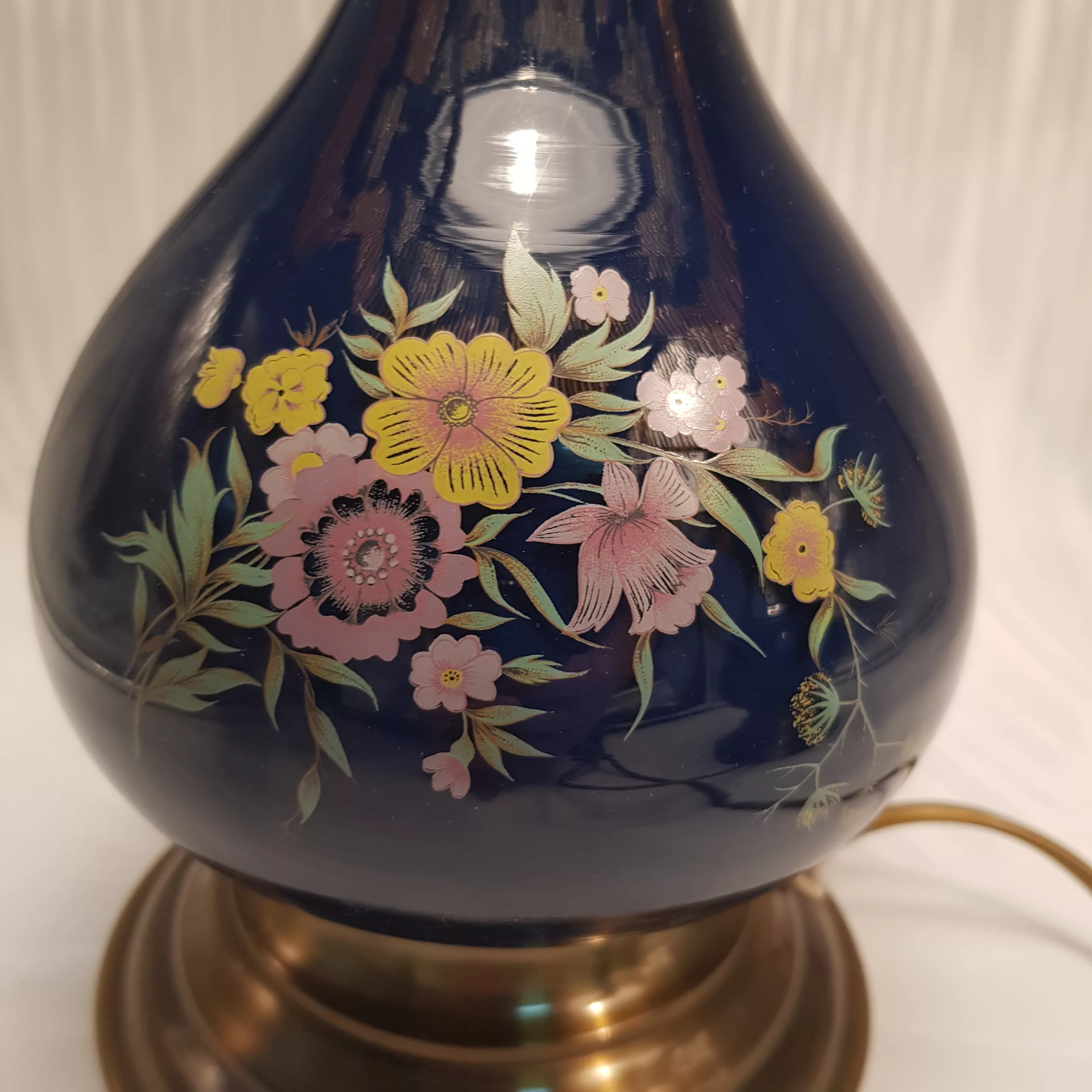 Flared base with the same floral decor as on the lampshades. Brass foot.
