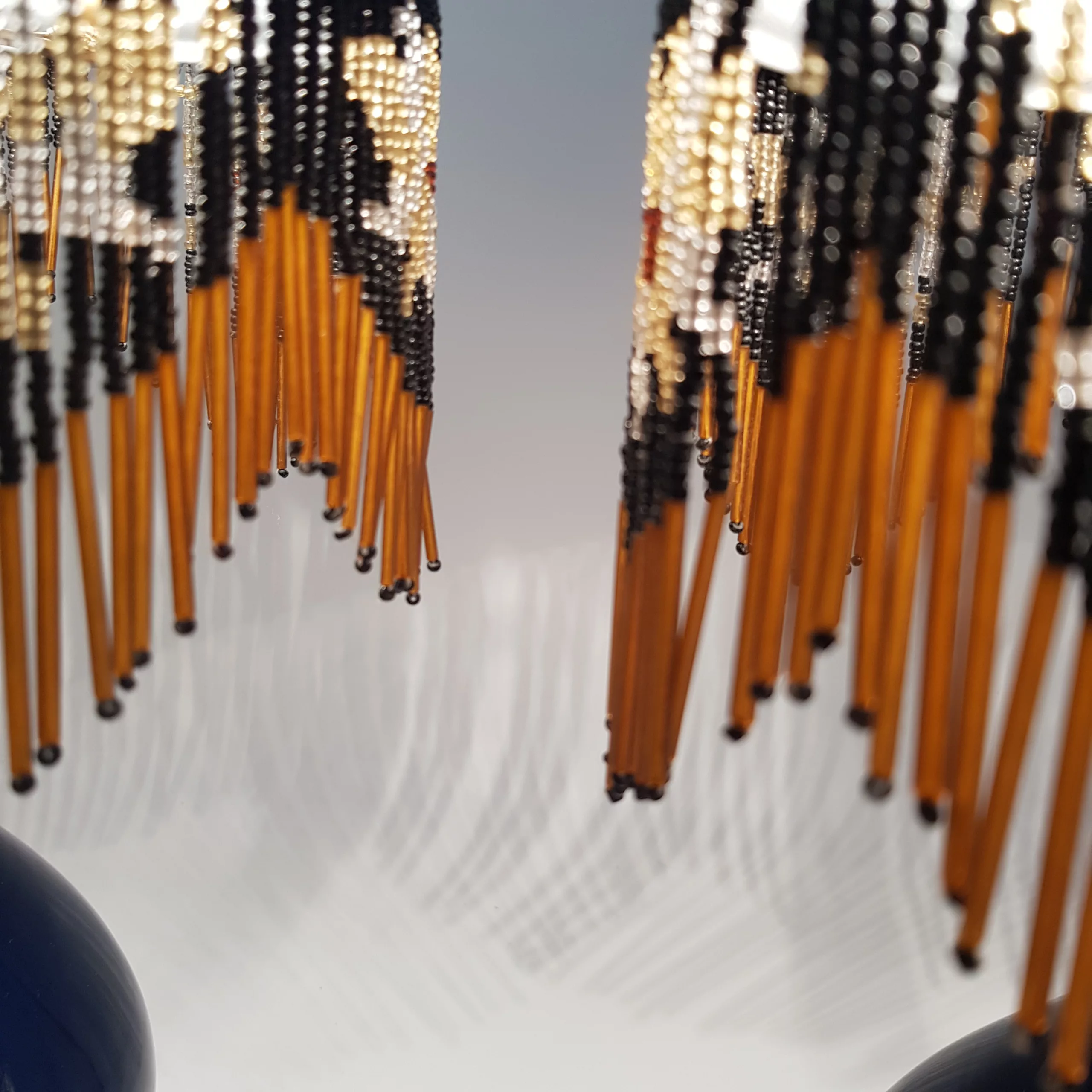 Vintage product that has already been used. Limited scuffs from use. No chip or crack to the glass. On one lamp, the fabric holding the fringes all together has slipped from under the golden embroidery that is supposed to hide it, creating a misalignement between the pearls on one side of the lamp. Few signs of ageing to the brass. Please see the video and the pictures.