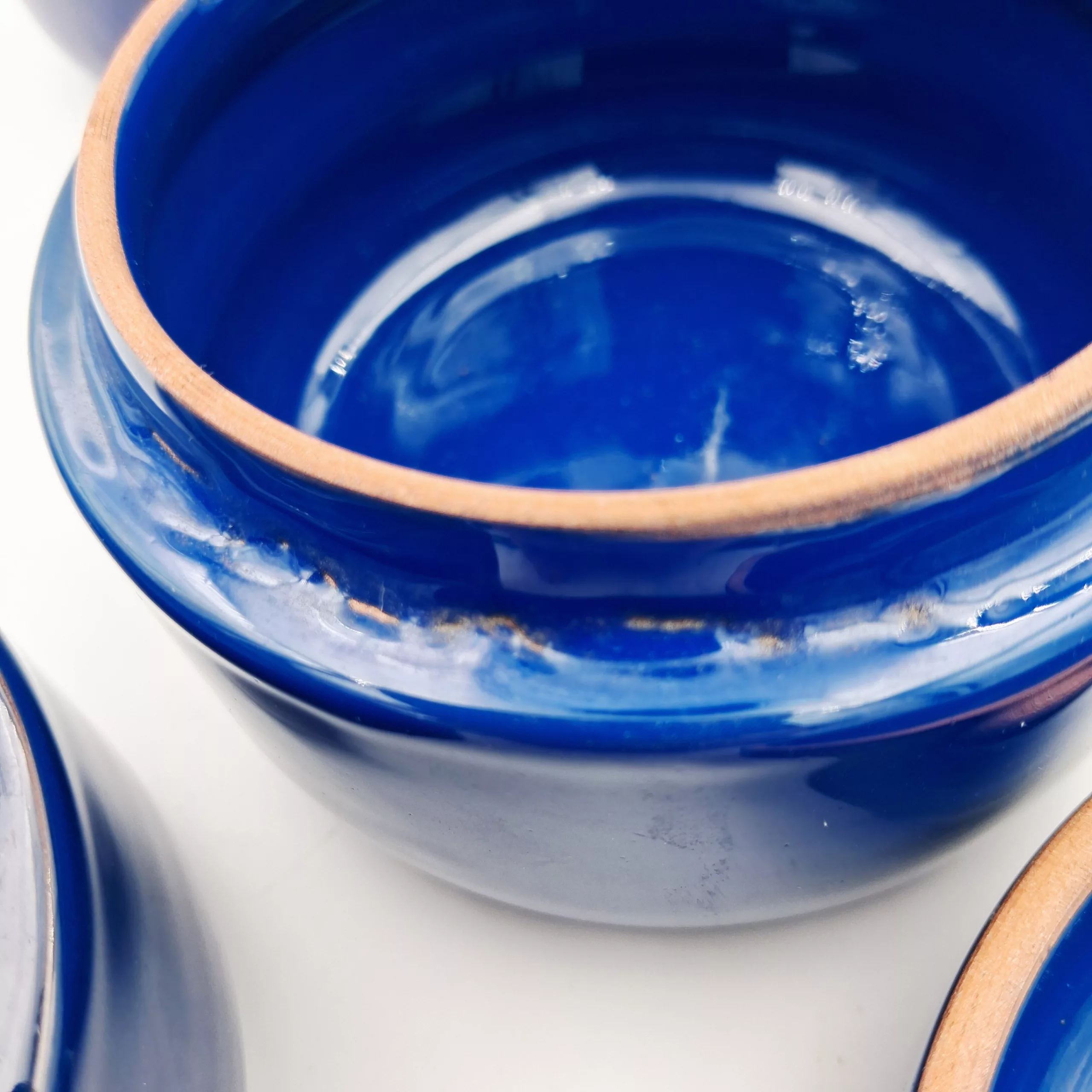 Vintage products that have already been used other than for decorative purposes only. Good overall condition. One small chip inside a lid, not visible when on the pot. Scratches inside the bowl, iridescent stains. On one lid, visible stain likely due to scotch tape that remained for too long on the ceramic. Some stains / visible signs of use inside the pots. Please see the video and the pictures.