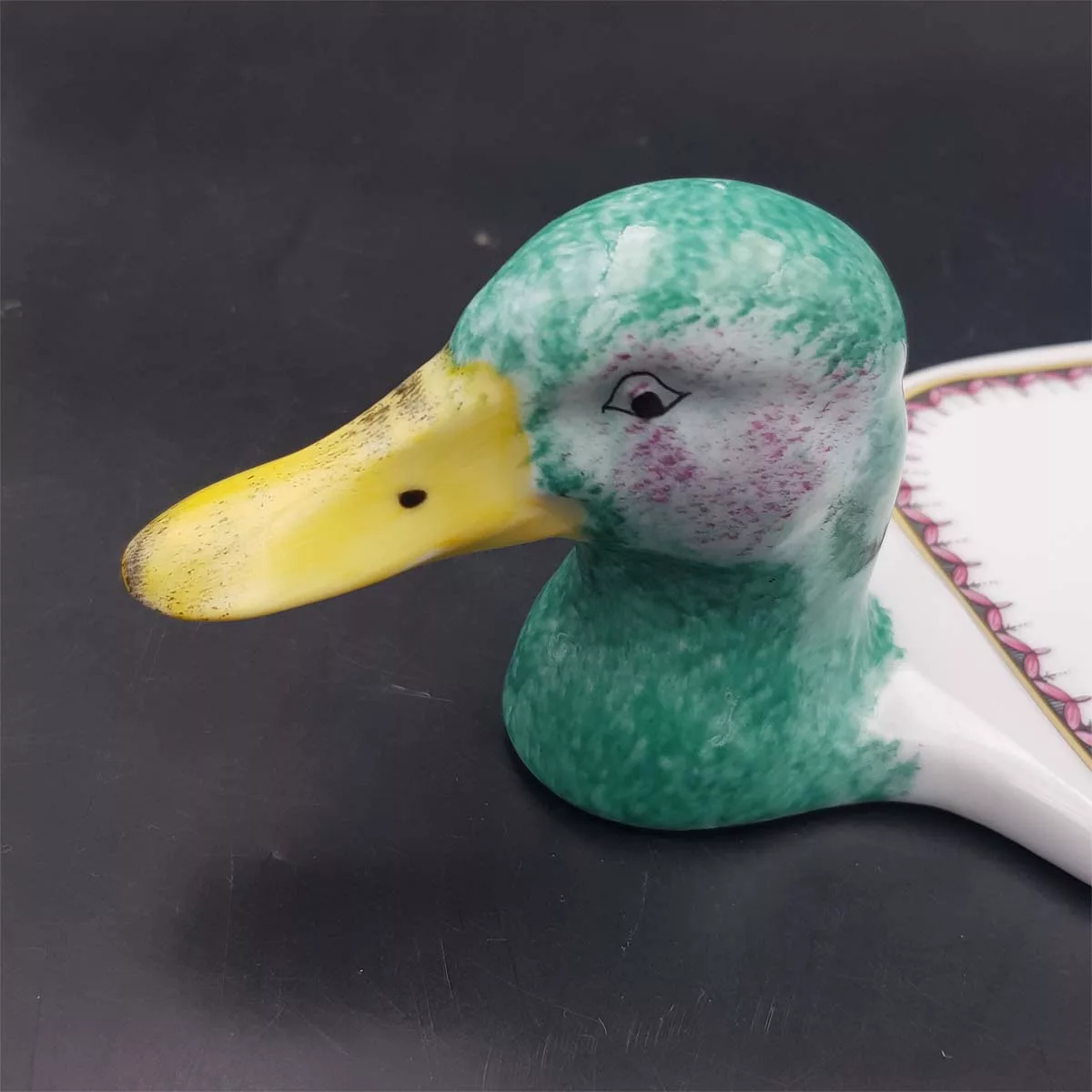 In the shape of a duck, with its head and tail in green, yellow and purple tones. Central area for serving the foie gras is white with a border decoration of stylized garlands in pink and gilt tones.