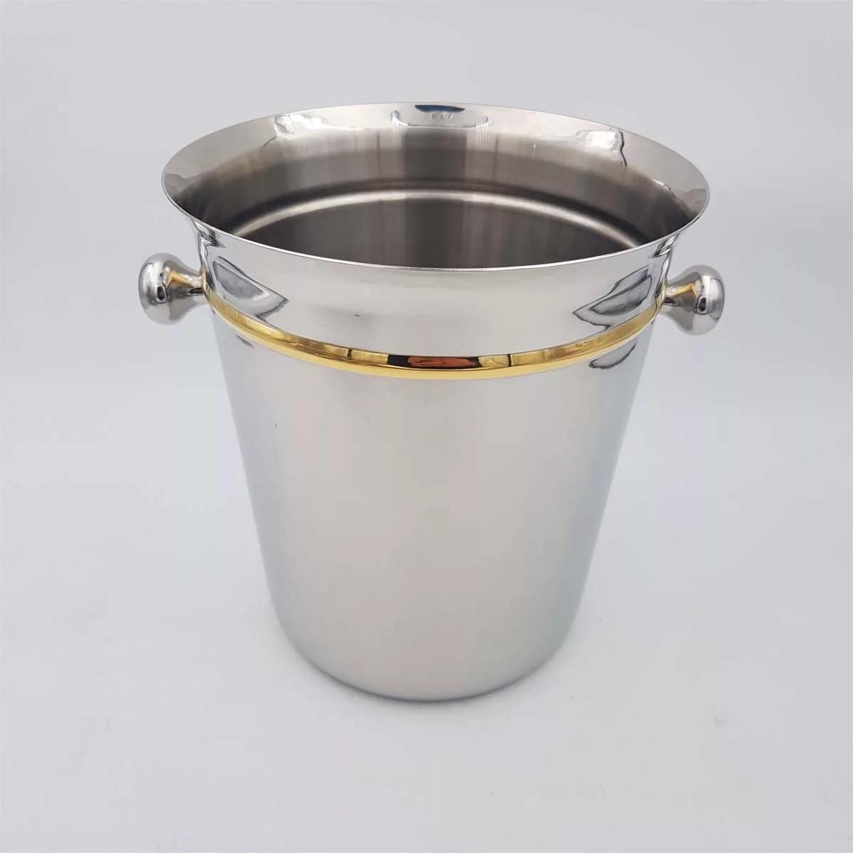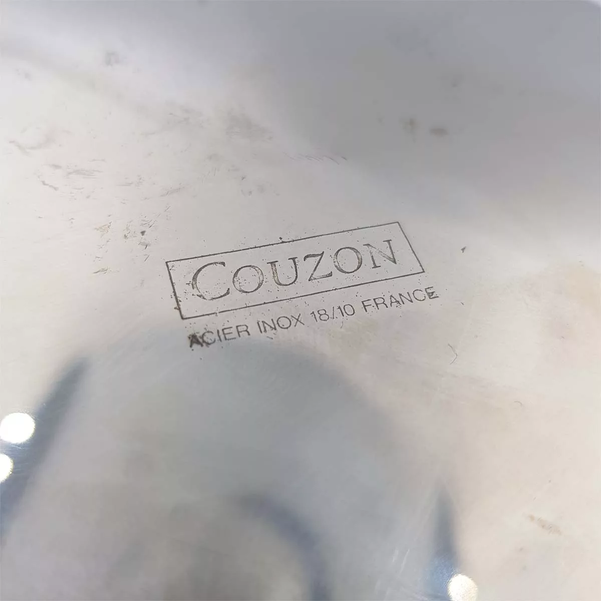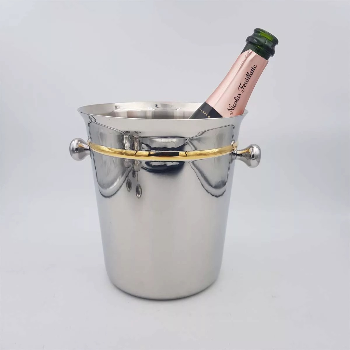 Vintage stainless steel champagne cooler / champagne bucket from french silversmith Jean Couzon, 1980s. “18-10” steel quality, very solid and extremely bright. 24K fine gold border around the neck, just above the 2 handles.