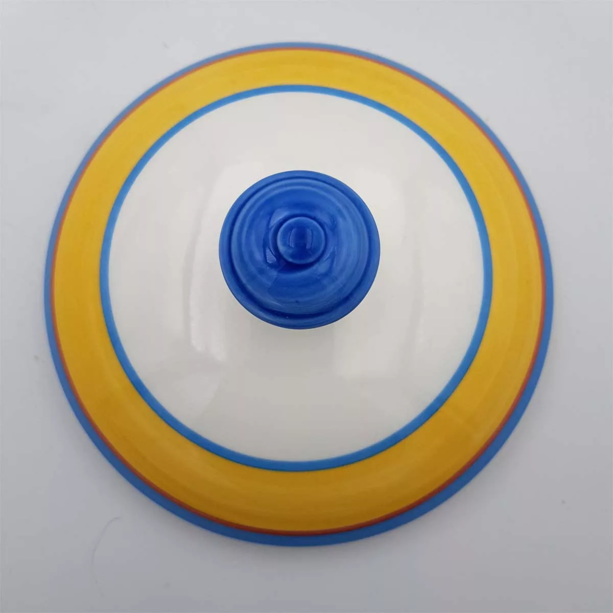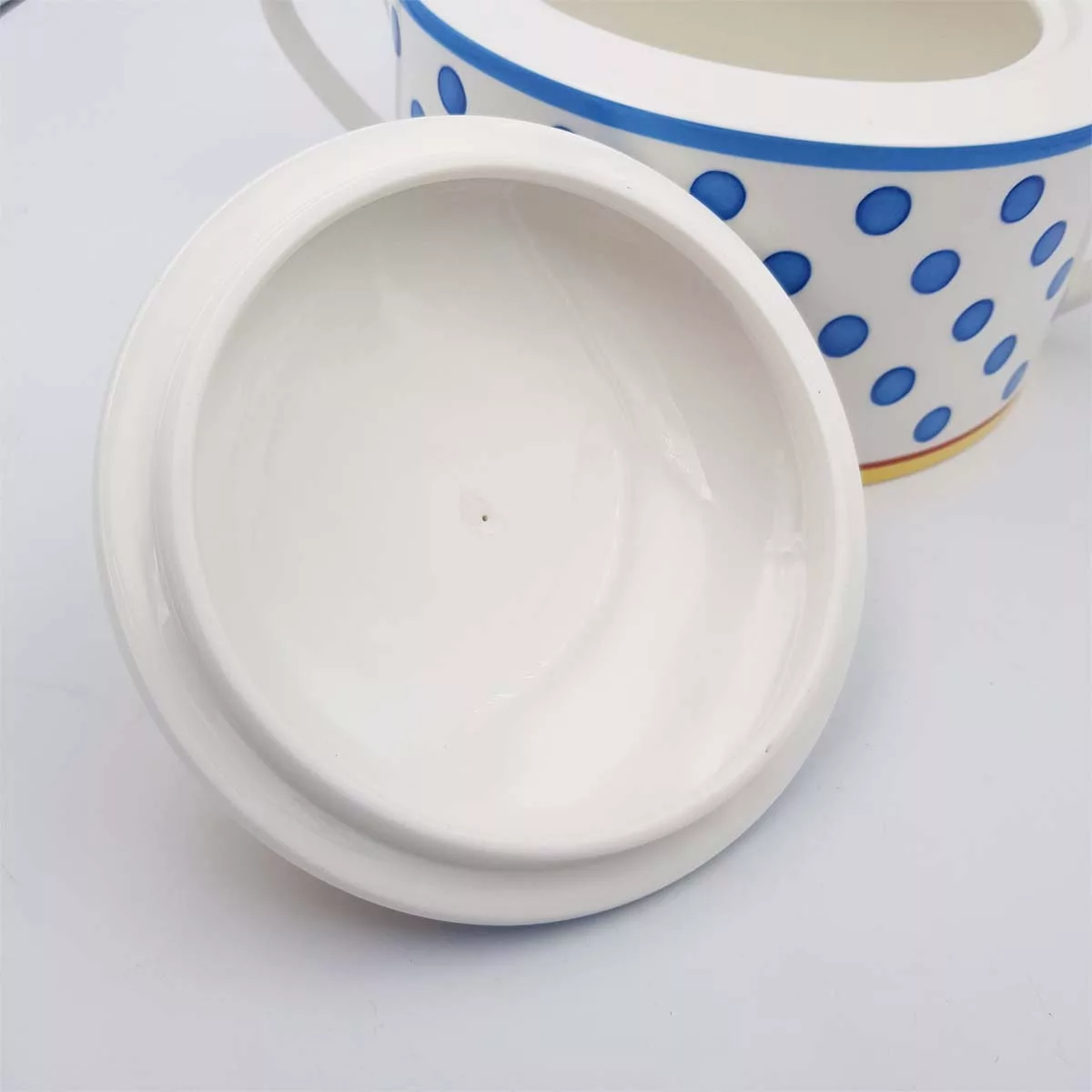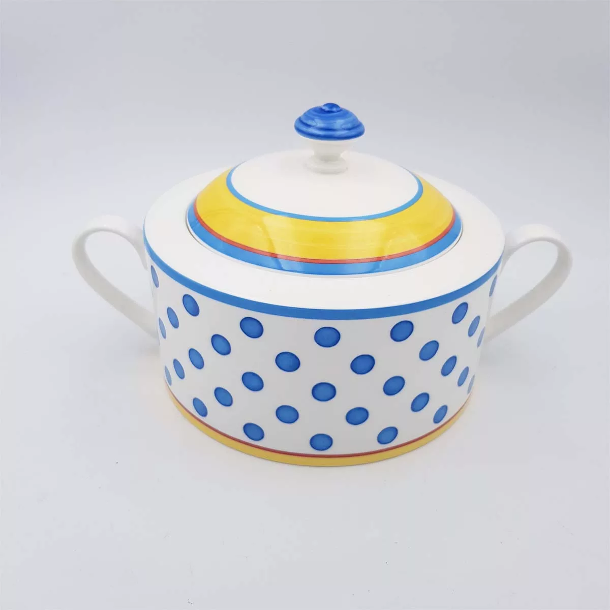 Lovely Villeroy & Boch tureen in porcelaine, 2L capacity. “Twist Anna” collection with its big blue dots on a white background, and concentric circles in yellow, red and blue tones on the lid. Handles.